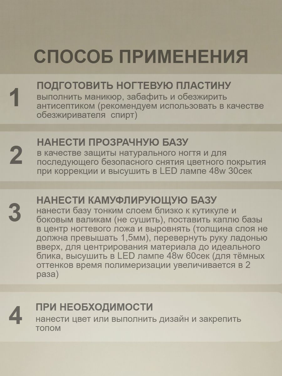 ВАЖНО! Для тёмных оттенков время полимеризации увеличивается в 2 раза.